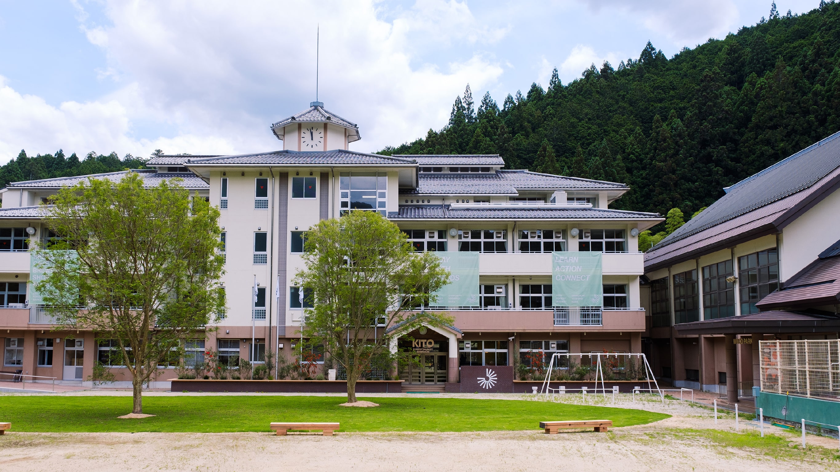 美しい森の合間から聞こえる鳥たちの声と、秋野川のせせらぎの音。それらをかたちづくる、溢れるほどの森の木々。下市町の人々は古くからずっと、木と共に生きてきました。ずっと大切に受け継がれてきた、そうした暮らしの本質的な価値を改めて理解して、心に、身体に、環境に、より良く過ごすこと。わたしたちはそうした時間こそが「本当の贅沢」であると考え、かつて下市南小学校だったこの場所を、木に囲まれた温かい複合施設にリノベーションしました。